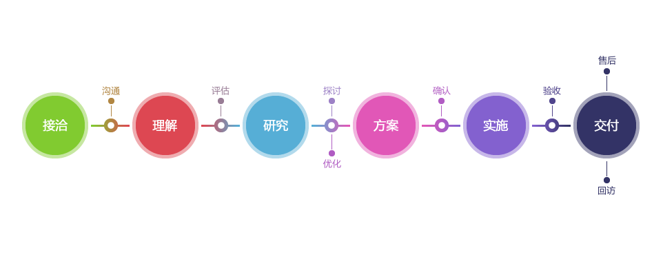 清晰、可视、可持续改进的研发流程服务,在每个环节我们都秉承着打造高品质移动互联网解决方案的开发理念。